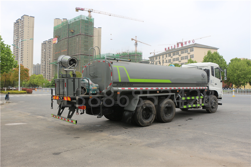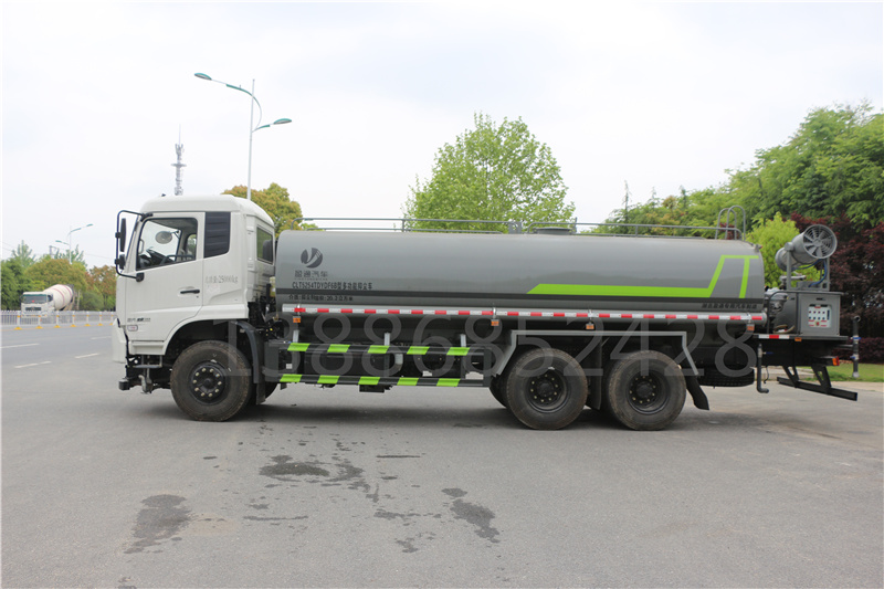 天錦22方灑水車_東風天錦22方抑塵車_國六22方灑水車_湖北盈通專用汽車有限公司,車用途為抑塵降霾,主要裝置為罐體及噴霧裝置;隨底盤選裝駕駛室;罐體有效容積:20.2立方米,罐體外形尺寸(×長軸×短軸)(mm):6700×2450×1580;側后防護情況:側、后防護材料均為:Q235碳鋼,連接方式均為:螺栓連接,后部防護截面尺寸(mm):120×50,后部防護離地高度(mm):480;ABS型號/生產廠家:3631010-C2000/東科克諾爾商用車制動系統(十堰)有限公司,J ABS/焦作博瑞克控制技術有限公司.選裝噴霧裝置樣式。采用底盤4350+1350軸距(mm)。選裝擋泥板樣式。