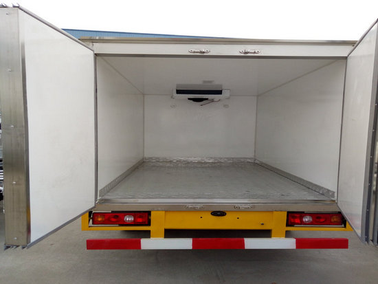 冷藏車廂體:采用國標A級聚氨酯保溫材料,厚度為8厘米,廂體內外采用玻璃鋼材質全包裹。不銹鋼鎖件。包角、包邊鋁合金型材。底盤采用高強度花紋鋁板定制。可選裝肉鉤導軌,和底部通風槽。