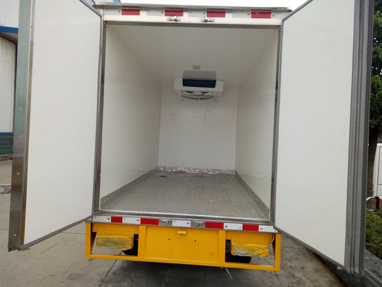 冷藏車廂體:采用國標A級聚氨酯保溫材料,厚度為8厘米,廂體內外采用玻璃鋼材質全包裹。不銹鋼鎖件。包角、包邊鋁合金型材。底盤采用高強度花紋鋁板定制。可選裝肉鉤導軌,和底部通風槽