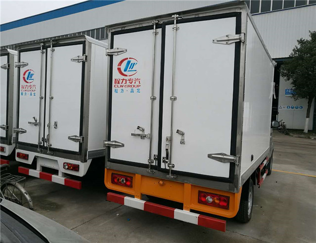 冷藏車廂體:采用國標A級聚氨酯保溫材料,厚度為8厘米,廂體內外采用玻璃鋼材質全包裹。不銹鋼鎖件。包角、包邊鋁合金型材。底盤采用高強度花紋鋁板定制。可選裝肉鉤導軌,和底部通風槽。