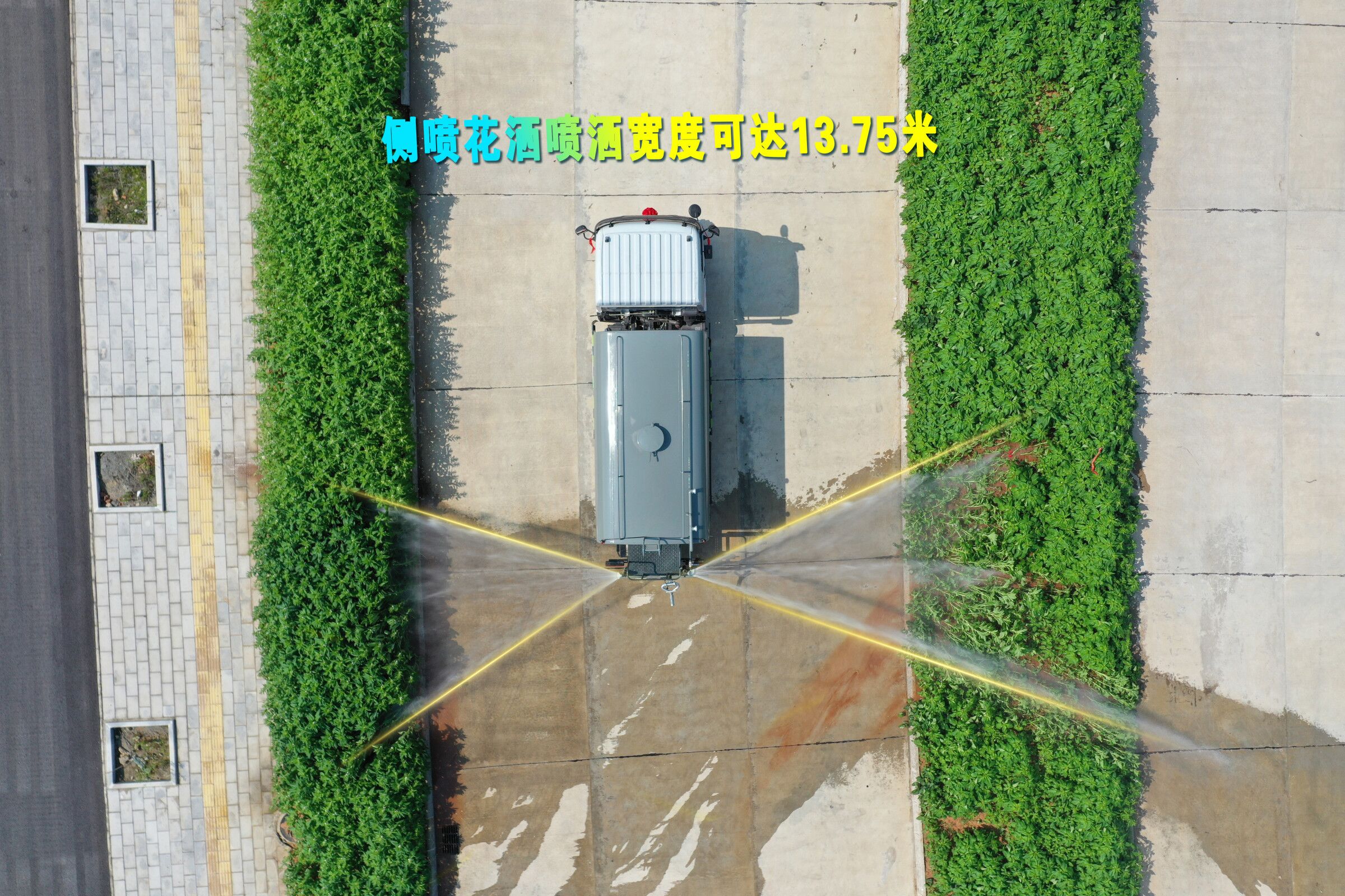 6、灑水車前噴頭位置較低,靠近地面,噴灑壓力較大,可用于沖洗路面;后噴頭位置較高(灑水車后噴頭一般左右各安裝一個),灑水面較寬,可用于公路施工灑水,使用后噴頭時,應將前噴管關閉;使用可調噴頭灑水時,灑水寬度可根據需要調整。灑水寬度越寬,中間重疊量越少,灑水密度越均勻。